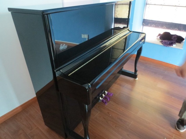 走路時(shí)必須注意,鋼琴不能過度傾斜,它與地面的斜度不能超過70度。搬動(dòng)時(shí),鋼琴背朝墻,鍵盤朝樓梯扶手。二個(gè)在下,三個(gè)在上,最好用寬布條背在肩上搭著鋼琴的車腳。與此同時(shí),雙手抓住琴背的手柄和鍵盤下面(不能拉鋼琴的腿),將鋼琴抬起,一鼓作氣移到地面,然后休息。尤其注意,鍵盤的一側(cè)不要碰扶手,腳不要碰樓梯。拐彎到第一個(gè)樓層的時(shí)候要小心碰撞,調(diào)整好方向后再抬起向上。進(jìn)入房間時(shí),還要小心擦拭門框,確保最后將鋼琴安全地放在已安排好的位置。